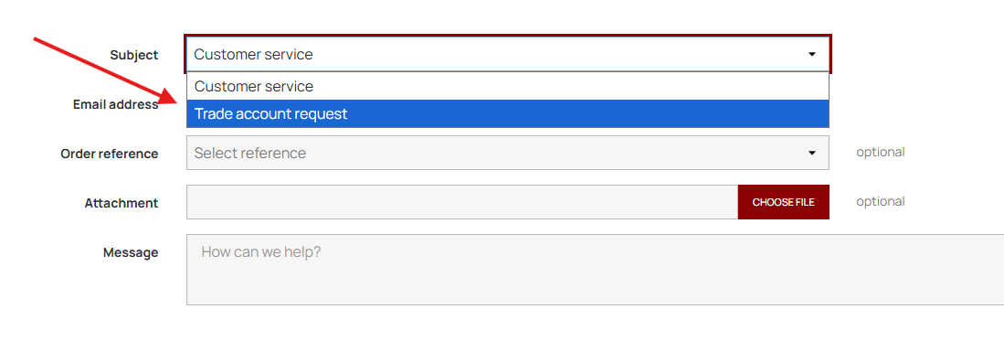 Finally, click on the 'contact us' link at the bottom of the page, choose 'Trade account request' in the subject line and fill in your details. If necessary, don't hesitate to send us any suited documents to validate your account.